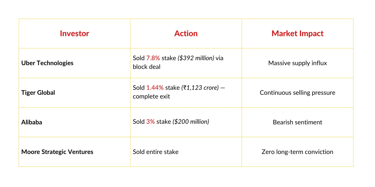Then July 2022 arrives. The one-year lock-in expires. Uber sells its 7.8% stake. Tiger Global exits completely. Alibaba dumps shares. The stock crashes to ₹47.55.