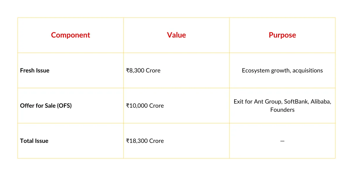 Zomato's July 2021 IPO appeared more balanced on paper—₹9,000 crore Fresh Issue vs. only ₹375 crore OFS (about 4%). The low OFS created artificial scarcity, driving the stock from its issue price of ₹76 to a peak of ₹169 within months. Retail investors celebrated. The "India Growth Story" was real.
