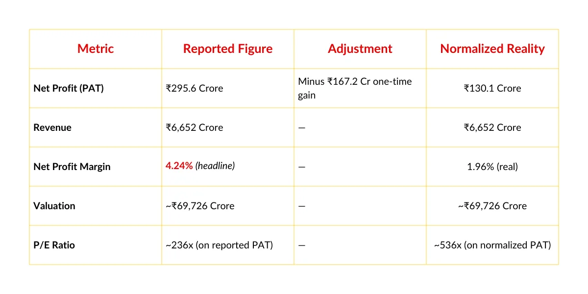 This is not valuation. This is speculation dressed up as analysis. And the one-time gain that inflated the headline profit by 2.3x? That's the golmaal—the accounting sleight-of-hand that makes a thin-margin, capital-intensive retail business look like a tech unicorn.