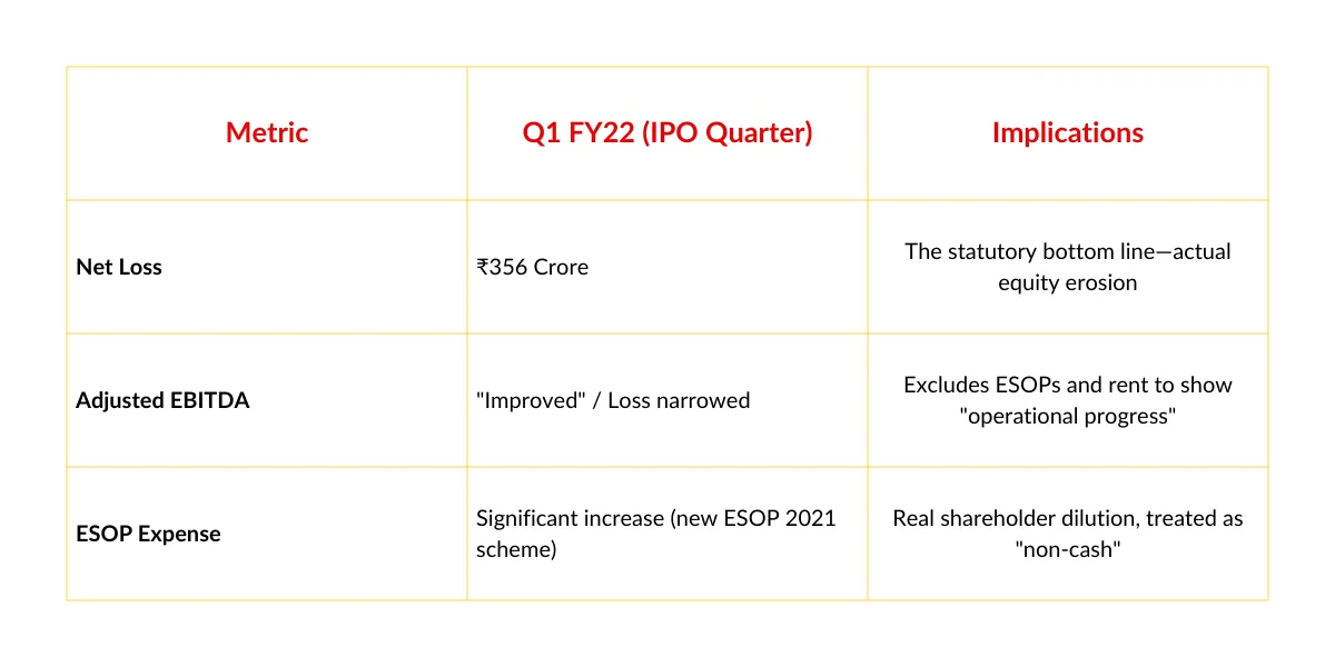 Zomato touted "Adjusted EBITDA improvements" while bleeding ₹356 crore in actual losses in the quarter it went public. The company was burning cash, issuing massive stock grants to employees (diluting existing shareholders), and paying substantial rent—but all of this was swept under the rug of "adjustments."