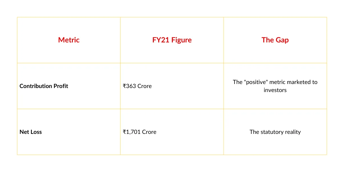 In the lead-up to the IPO (FY21), Paytm touted a Contribution Margin of 30% and a Contribution Profit of ₹363 crore. This was the metric sold to investors during roadshows. It sounded healthy. It suggested positive unit economics.